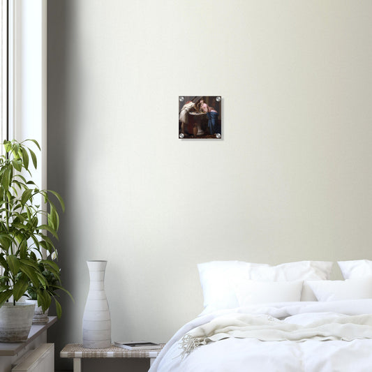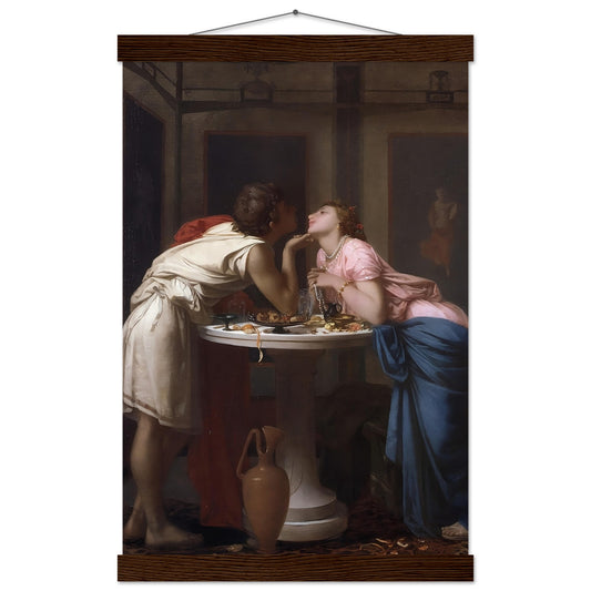 Auguste Toulmouche's 1853 painting "A Classical Courtship" is a masterful depiction of romantic tension and classical elegance. Set against the backdrop of an opulent Roman interior, the scene captures an intimate moment between a young man and woman. The young woman, adorned in a pink dress with blue drapery, leans sensuously over a marble table, her eyes closed as she anticipates a kiss. Her companion, dressed in a white tunic with a red cloak, reaches out to gently touch her chin, their lips nearly meeting in a tender yet tantalizing moment of courtship. The table is set with an array of delicacies, hinting at a feast that has been interrupted by their burgeoning passion. Toulmouche’s meticulous attention to detail is evident in the intricate patterns on the walls, the rich textures of the fabrics, and the lifelike portrayal of the figures, making the painting a vivid celebration of classical beauty and romantic allure.