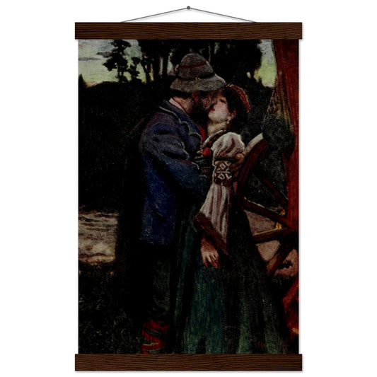 Byam Shaw's 1910 Art Nouveau painting, "Pagliacci - 'Nedda and Her Lover'," beautifully captures the passionate yet tragic love story from the famous opera "Pagliacci" by Ruggero Leoncavallo. In this piece, Shaw uses rich, deep colors to convey the intensity of the lovers' emotions. The central figures, Nedda and her secret lover, are depicted in a tender embrace, their bodies entwined in a moment of forbidden love. The background, with its dark, shadowy trees and muted tones, creates a stark contrast, emphasizing the clandestine nature of their romance. Shaw's attention to detail is evident in the intricate patterns on Nedda's traditional attire and the textured brushstrokes that bring the scene to life.