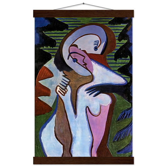 Ernst Ludwig Kirchner's "Lovers (The Kiss)" is a striking example of German Expressionism, characterized by its bold lines, vivid colors, and emotional intensity. Painted in 1930, this piece depicts two lovers in a passionate embrace, their forms entwined in a dance of vibrant hues and exaggerated shapes. The angular and fluid lines converge to create a sense of movement and intimacy, capturing the raw, unfiltered emotion of the moment. Kirchner's use of color is particularly noteworthy, with contrasting shades of blue, pink, and green highlighting the figures against a dark, abstract background. This painting is a testament to Kirchner's ability to convey deep emotional resonance through his distinctive artistic style.