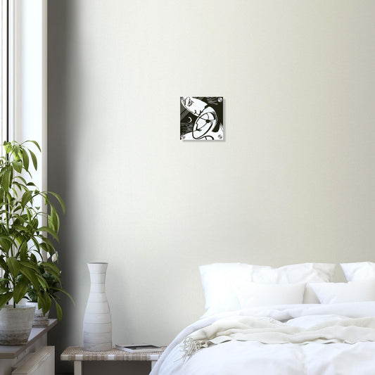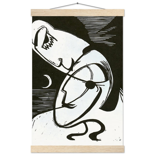 Ernst Ludwig Kirchner's 1930 woodcut, "The Kiss," captures an intense, emotional moment between two figures rendered in his signature expressionist style. The intertwined forms of the lovers are simplified into bold, black and white lines, creating a powerful contrast that emphasizes their unity and connection. Kirchner's use of abstract shapes and sharp angles conveys a sense of raw, unfiltered emotion, drawing the viewer into the intimate scene. The crescent moon in the background adds a touch of mysticism and timelessness to the composition, suggesting that this embrace transcends the physical world.