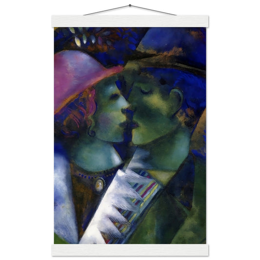 Marc Chagall's 1915 painting "Green Lovers" is a captivating example of Cubism, a revolutionary art movement that broke traditional perspectives and fragmented objects into abstract, geometric forms. This vibrant piece features two lovers sharing a tender kiss, their faces interwoven in a complex tapestry of shapes and colors. The bold use of green and blue hues creates a dreamlike quality, highlighting Chagall's unique ability to blend fantasy with reality. The lovers' expressions, though abstracted, convey deep emotion and intimacy, inviting viewers to explore the depth of their connection.