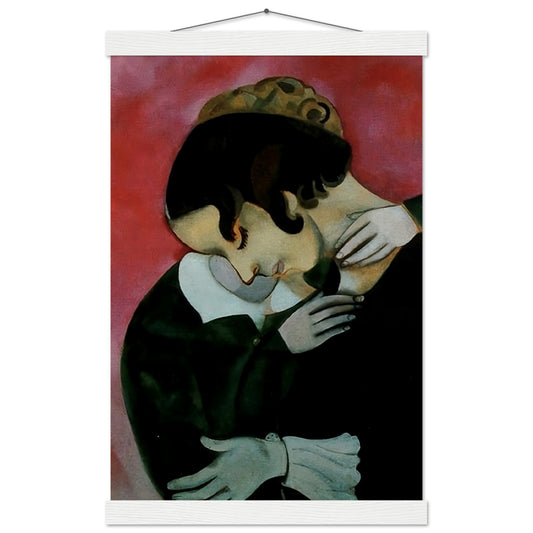 Marc Chagall's 1916 painting, "Lovers in Pink," is a beautiful exploration of intimacy and affection rendered in his signature whimsical style. The painting depicts a tender embrace between two lovers, their forms intertwined in a gentle, heartfelt connection. The background is a soft pink, enveloping the figures in a warm, dreamlike atmosphere. Chagall's use of color and form highlights the emotional depth of the scene, with the lovers' faces and hands delicately drawn to convey their deep bond. The man, dressed in a dark green suit, and the woman, in contrasting lighter tones, create a harmonious balance within the composition, emphasizing their unity.