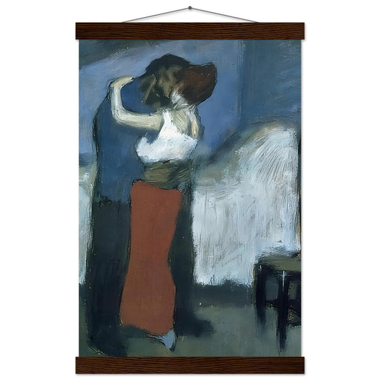 Pablo Picasso's 1900 painting "Embrace" captures an intimate and tender moment between two figures, enveloped in an emotional and physical closeness. The scene is characterized by the use of soft, muted colors and broad brushstrokes that create a sense of immediacy and raw emotion. The figures, partially obscured and seemingly merging into one another, convey a profound sense of unity and affection. The setting, with its simple furnishings and subdued lighting, enhances the focus on the figures, drawing the viewer into their private world. This early work of Picasso reflects his exploration of human connection and the complexities of intimate relationships.