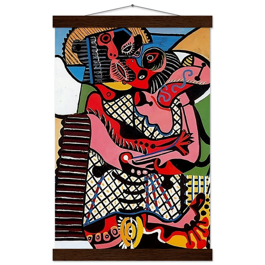 The painting's vibrant palette and dynamic composition draw the viewer into the tumultuous and passionate world of the subjects. Each element of the painting seems to pulsate with energy, reflecting the emotional depth and complexity inherent in human relationships. Picasso's use of distorted shapes and vivid colors serves not only to captivate the eye but also to evoke a visceral response, making "The Kiss" a profound and thought-provoking piece. This masterpiece stands as a testament to Picasso's genius in capturing the essence of human emotion through abstract and surrealistic means.