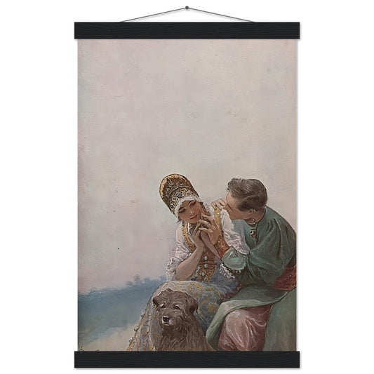 Sergey Solomko's "Declaration of Love" is a captivating piece of art that exudes the romantic charm and intricate details typical of the artist's work. Painted in a realistic style, this genre painting beautifully captures a tender moment between two lovers, surrounded by a serene atmosphere that enhances the intimacy of the scene. The young man and woman, adorned in traditional Russian attire, share a quiet, heartfelt exchange that speaks volumes about the depth of their emotions. The inclusion of a dog at their feet adds a layer of warmth and loyalty to the composition, creating a tableau that feels both personal and timeless.