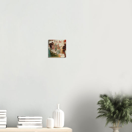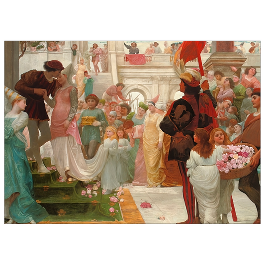 "The Prince's Choice" by Thomas Reynolds Lamont, created in 1881, is a significant work in the genre of historical and genre painting. This oil on canvas piece, measuring approximately 60 x 102 inches (5 x 8.5 feet), captures a wildly romantic scene amidst a bustling and vividly celebratory crowd. The painting has passed through several notable auctions, including Christie's in 1978 and Sotheby's in 1983, reflecting its ongoing appeal and value among collectors and art historians. Lamont, a 19th-century British artist known for his detailed and vibrant genre scenes, has captured a moment rich in texture, color, and narrative, making it a notable example of Victorian art.